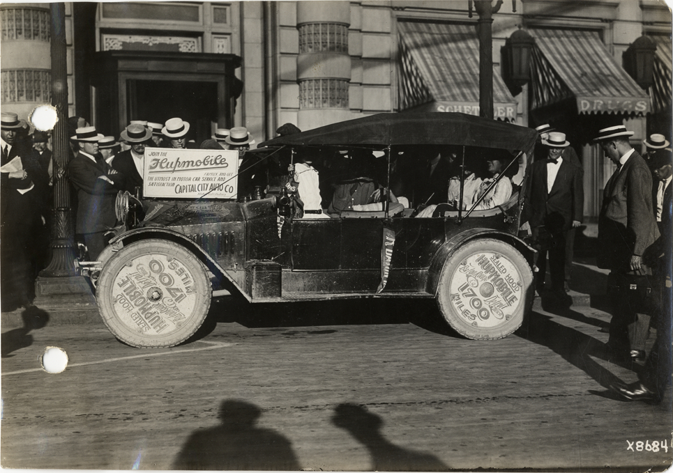 View of spectators surrounding Hupmobile car in front of the Pontchartrain Hotel at Detroit, Michigan. Wheel covers read: "Sealed hood Hupmobile, Baton Rouge, La., Detroit, Mich., 1700 miles." Sign displayed on car reads: "Join the Hupmobile family and get the utmost in motor car service and satisfaction, Capital City Auto Co." Fred Perkins drove a Hupmobile with sealed hood, crank handle and battery box 1700 miles from Baton Rouge, Louisiana to Detroit, Michigan. Handwritten on back: "Photo taken for Hupp Motor Car Co. Tours--Hupmobile Baton Rouge to Detroit, 1914."
