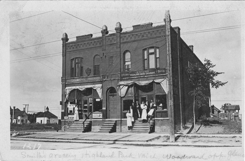 Two-story stone or brick building housing two businesses, on the left, the Highland Park Pharmacy and Smith's Highland Park Grocery on the right. Pharmacy has "C.S. Prentiss" written on awning over doorway, woman standing by doorway, several people, some men in grocery aprons, by doorway of grocery. Handwritten on card front: "Smith's Grocery, Highland Park, Mich., Woodward opp. Glendale." Card is postmarked Sept. 5th, 1911.
