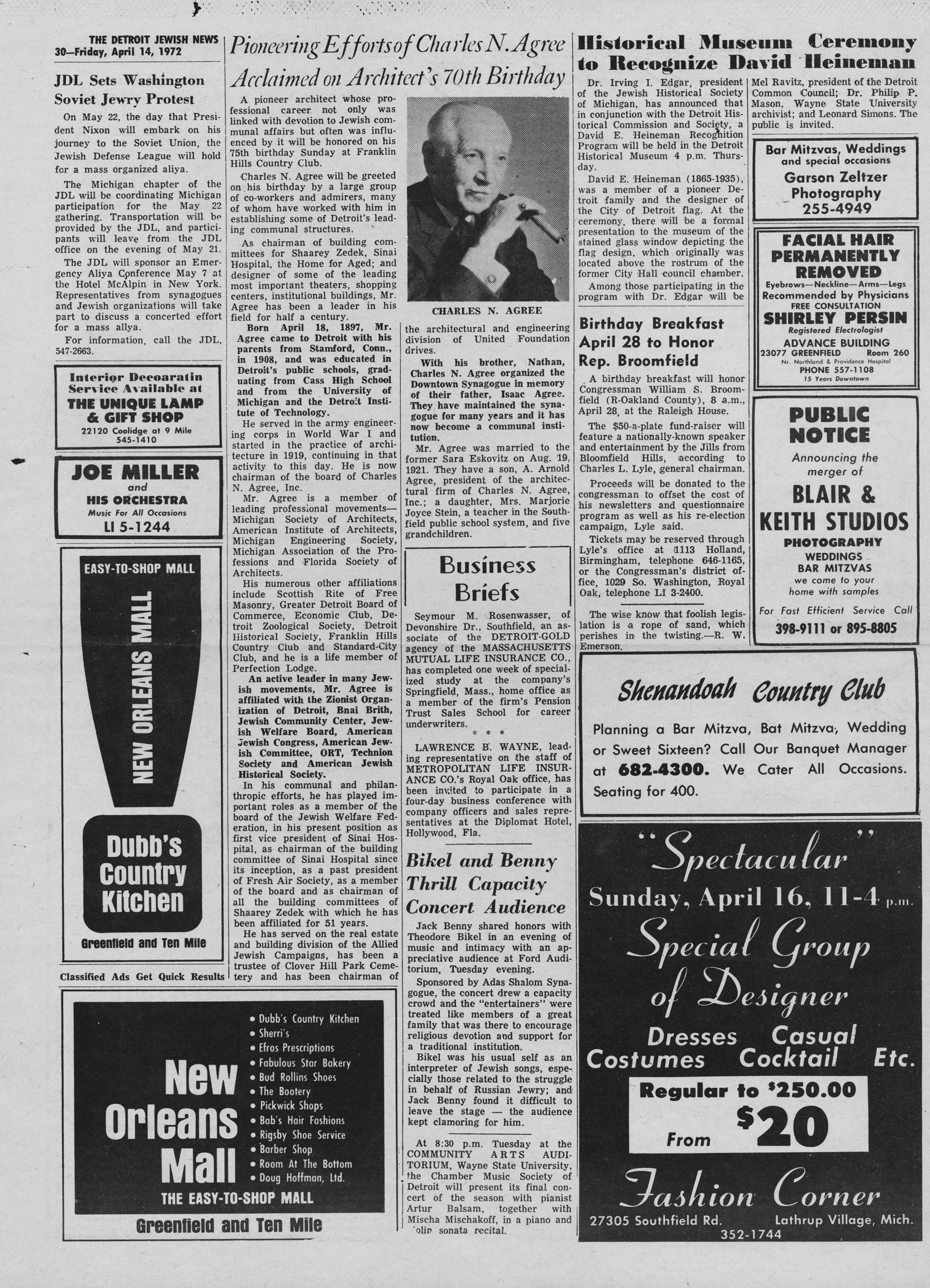 Favorite this☆ Agree's 70th birthday celebration Description: Article celebrating Agree's accomplishments for his 70th birthday. Details Resource ID: bh000035 Subject: Agree, Charles N. (Charles Nathanial), 1897-1982--Anniversaries, etc. Architects--Michigan--Detroit Clippings (Books, newspapers, etc.) Note (Source): Detroit Jewish News Date Issued: 1972-04-14 Format: 1 clipping ; 15.5 x 11.5 in. Member of: Burton Historical Collection Filing Location: MS/Agree, Charles N., Box 2, Biography folder Rights: Physical rights are retained by DPL. Copyright is retained in accordance with U.S. copyright laws.
