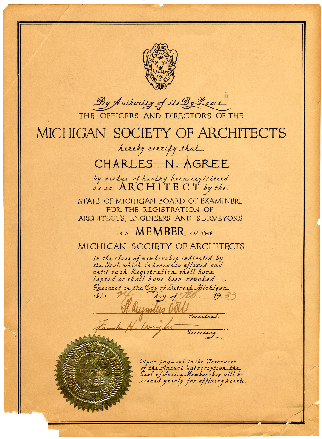 Charles Agree's membership certificate to the Michigan Society of Architects. Stamped on document back: "Chas. N. Agree, architect. Received Jul 20, (blank). Eleventh floor, Book Tower, Detroit, Mich."