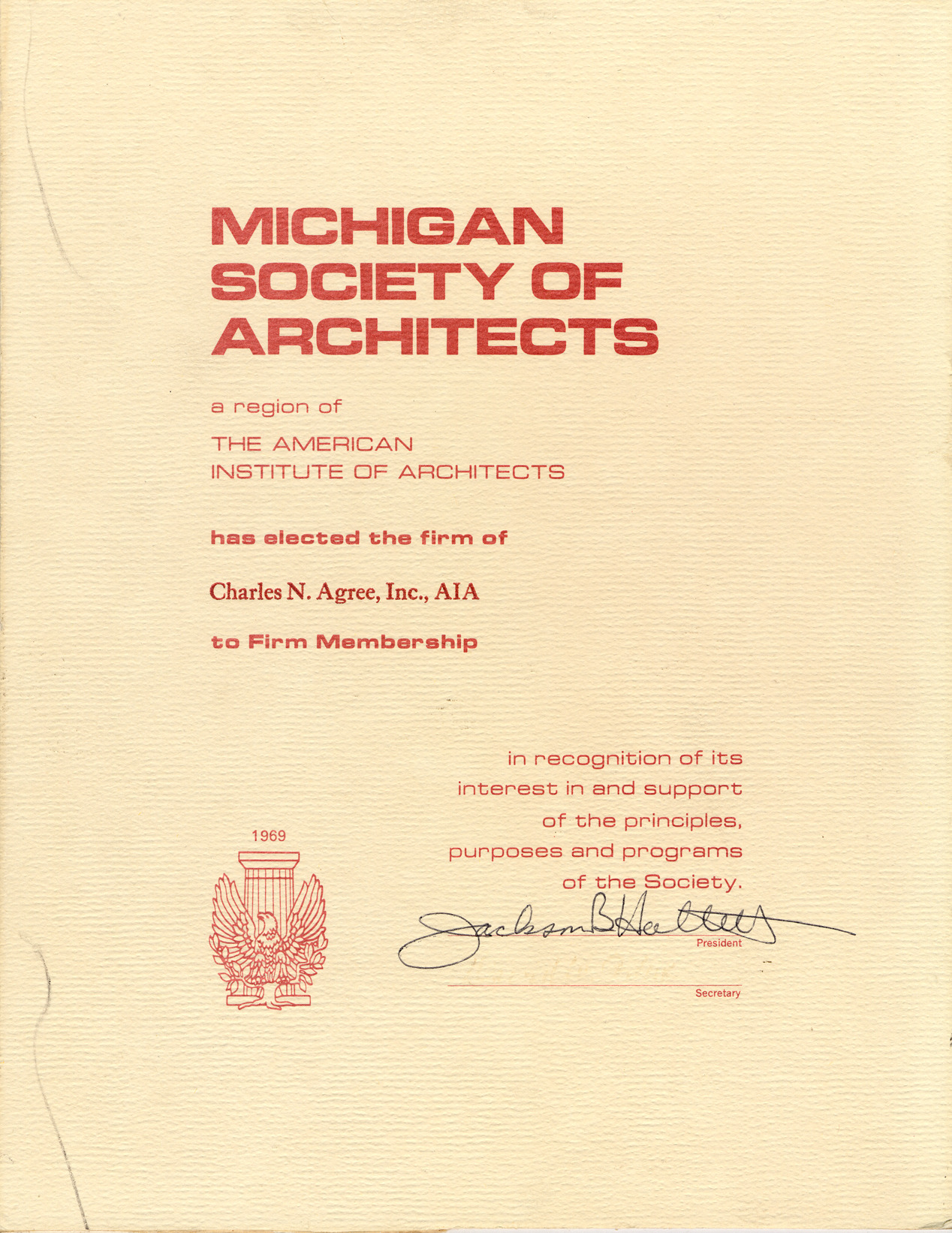 Favorite this☆ Firm membership certificate 1969 Description: Certificate recognizing the election of the firm of Charles N. Agree Inc. to firm membership in the Michigan Society of Architects. Details Resource ID: bh000043 Creator: Michigan Society of Architects Subject: Michigan Society of Architects Agree, Charles N. (Charles Nathanial), 1897-1982 Architects--Michigan--Detroit Certificates Date Issued: 1969 Format: 1 certificate ; 11 x 8.5 in. Member of: Burton Historical Collection Filing Location: MS/Agree, Charles N., Box 2, Biography folder Rights: Physical rights are retained by DPL. Copyright is retained in accordance with U.S. copyright laws.