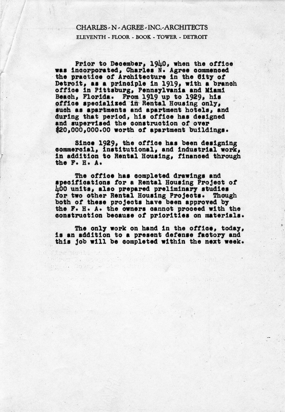 Favorite this☆ Brief history of the Charles N. Agree architectural firm Description: Brief history of the firm's history related to rental housing, citing Charles N. Agree's individual practice prior to 1940 (since 1919). Printed on the firm's letterhead. Details Resource ID: bh000046 Creator: Agree, Charles N. (Charles Nathanial), 1897-1982 Subject: United States. Army. Corps of Engineers--Civil functions Architecture--Michigan--Detroit Agree, Charles N. (Charles Nathanial), 1897-1982 Architects--Michigan--Detroit Date Issued: 1942 (year approximate) Format: 1 sheet ; 11 x 8.5 in. Member of: Burton Historical Collection Filing Location: MS/Agree, Charles N., Box 2, U.S. Engineering Office folder Rights: Physical rights are retained by DPL. Copyright is retained in accordance with U.S. copyright laws.