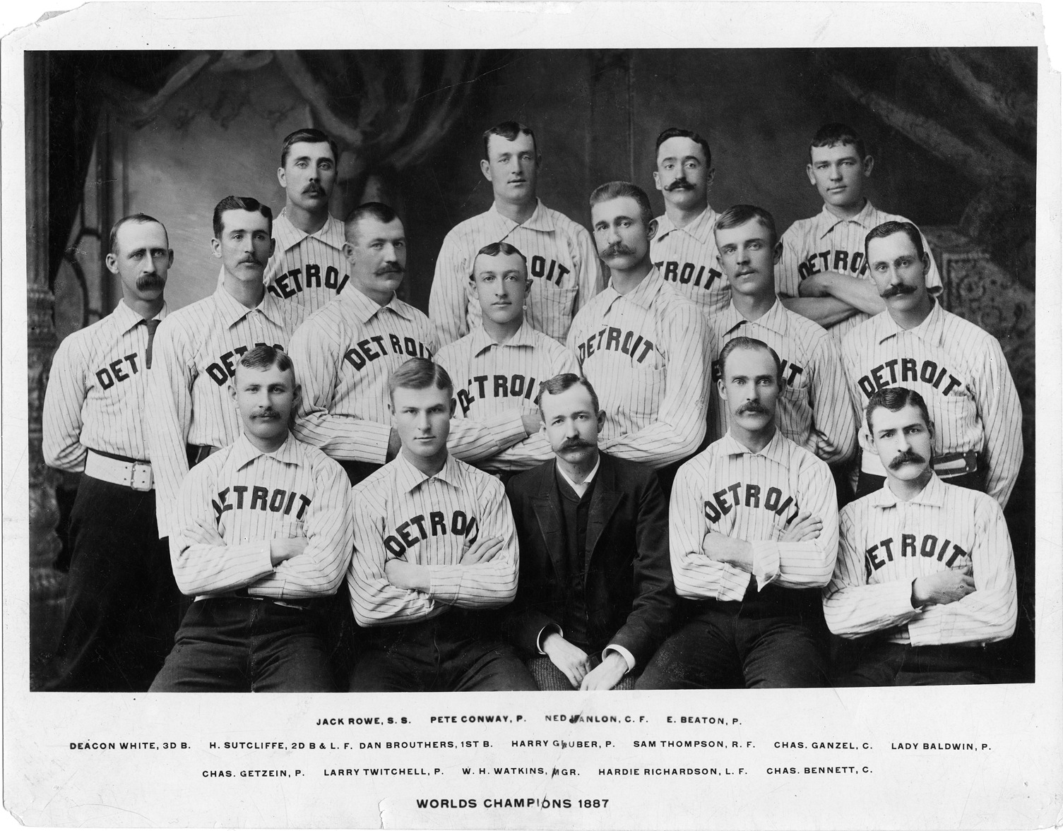 Group portrait of Detroit Wolverines baseball players and their manager; players wear striped shirts with "Detroit" on front. Printed on front: "Jack Rowe, S.S.; Pete Conway, P.; Ned Janlon, C.F.; E. Beaton, P.; Deacon White, 3d B.; H. Sutcliffe, 2d B. & L.F.; Dan Brouthers, 1st B.; Harry Gruber, P.; Sam Thompson, R.F.; Chas. Ganzel, C.; Lady Baldwin, P.; Chas. Getzein, P.; Larry Twitchell, P.; W.H. Watkins, Mgr.; Hardie Richardson, L.F.; Chas. Bennett, C.; Worlds Champions 1887."