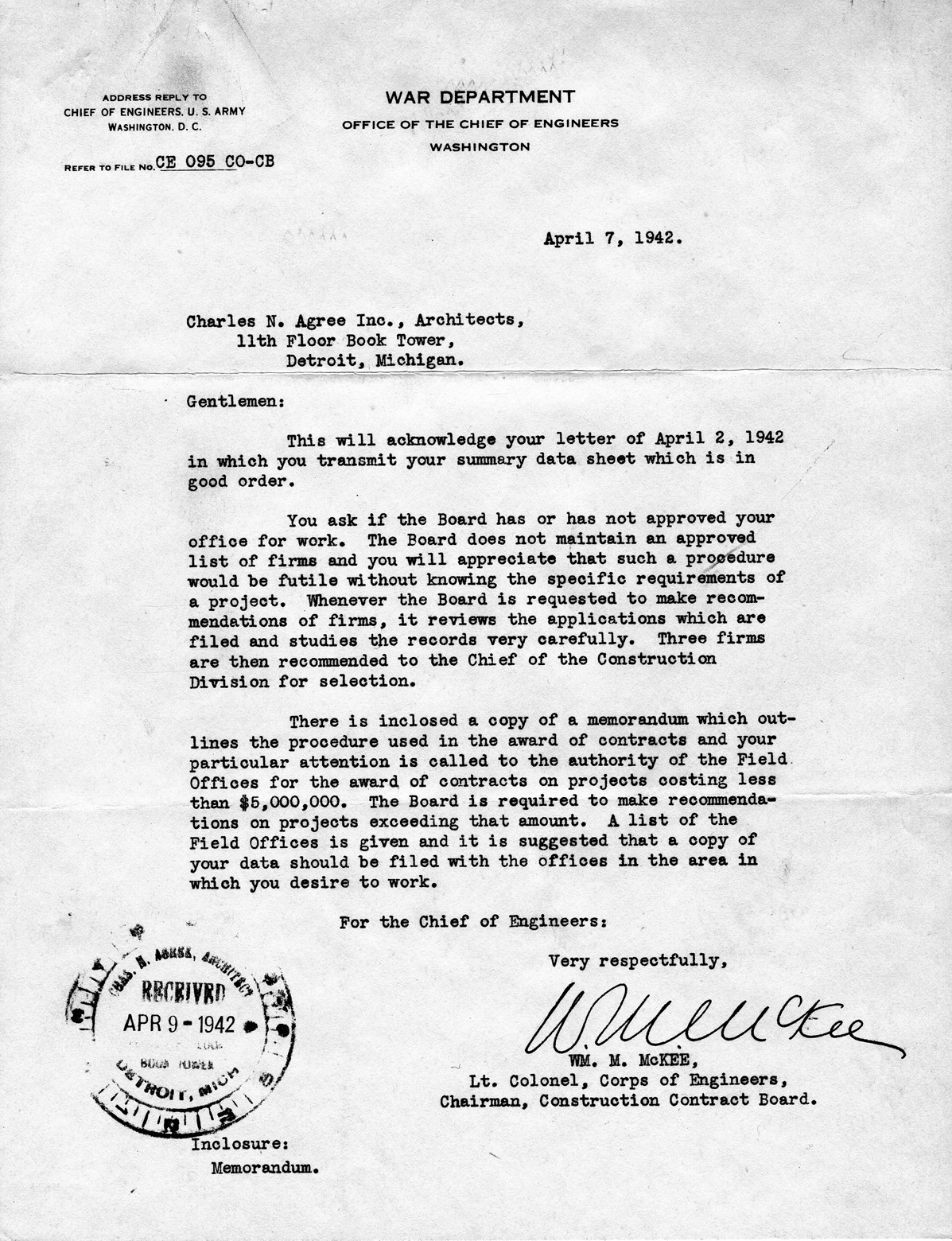 Letter from William McKee, chairman, Construction Contract Board to the Charles N. Agree, Inc. architectural firm. The letter is in response to a letter sent from Charles N. Agree, Inc. on April 2, 1942 regarding approval for work from the Construction Contract Board. The letter is printed on United States War Department letterhead. Stamped on page: "Chas. N. Agree, architect. Received April 9, 1942. Eleventh floor, Book Tower, Detroit, Mich." Typewritten at page bottom: "Enclosure: memorandum."