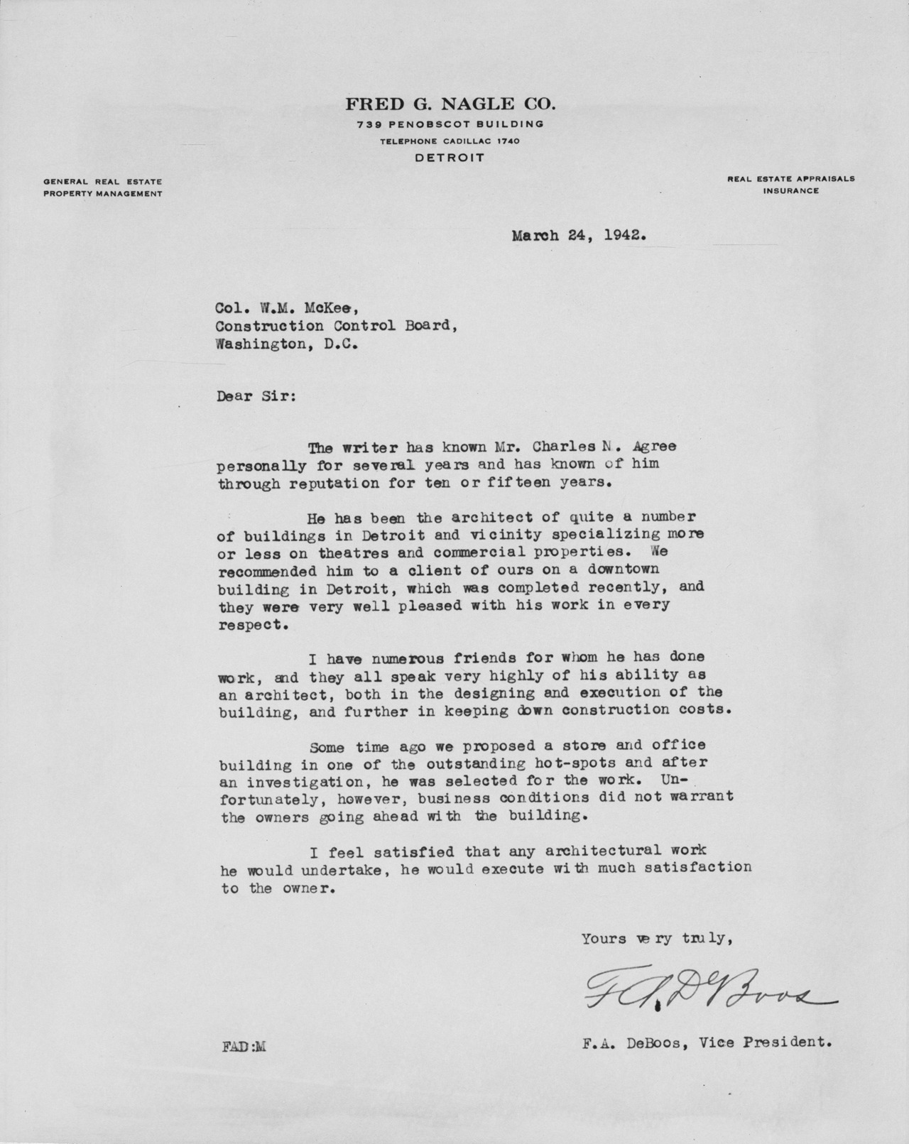 Letter of recommendation from F.A. DeBoos, vice president of Fred G. Nagle Co. (Detroit, Mich.) to the Construction Contract Board for the consideration of the Charles N. Agree architectural firm in the defense housing projects. Addressed to Col. William McKee. Printed on Fred G. Nagle Co. corporate letterhead: "Fred G. Nagle Co. 739 Penobscot Building, telephone: Cadillac 1740 Detroit. General real estate, property management, real estate appraisals, insurance." Letter is scanned from a negative photocopy.