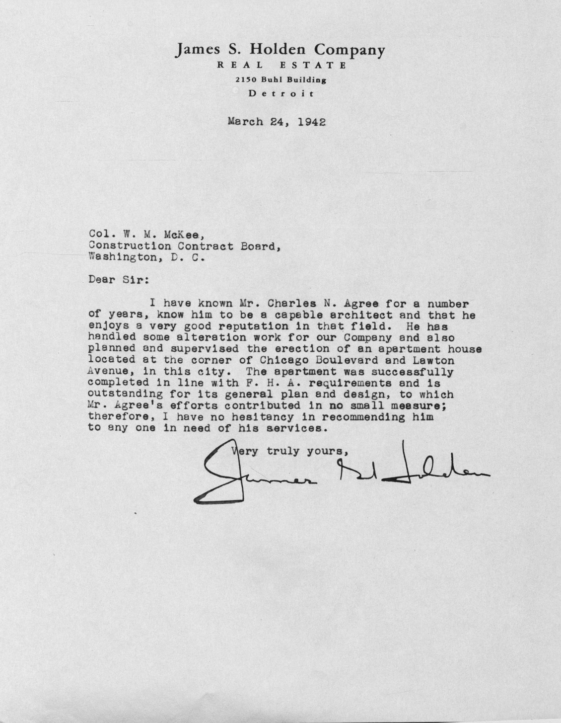 Letter of recommendation from James S. Holden real estate company to the Construction Contract Board for the consideration of the Charles N. Agree architectural firm in the defense housing projects. Addressed to Col. William McKee. Printed on corporate letterhead: "James S. Holden Company, real estate. 2150 Buhl Building, Detroit." Letter is scanned from a negative photocopy.