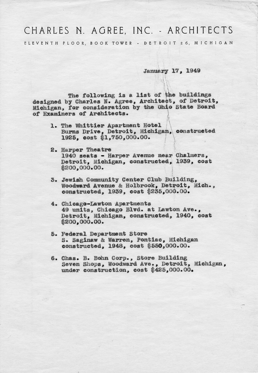 List of buildings designed by Charles N. Agree for the purpose of consideration by the Ohio Board of Examiners of Architects. The list includes: The Whittier Apartment Hotel, Harper Theater, Jewish Community Center Club building, Chicago-Lawton apartments, Federal Department store, Chas. B. Bohn Corp. building.