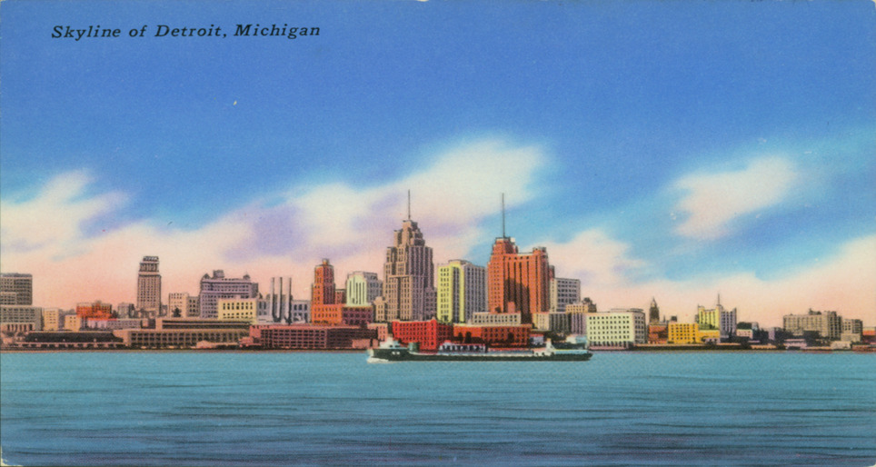 Skyline of Detroit viewed from Windsor, Ontario, with freighter passing. Printed on front: "Skyline of Detroit, Michigan." Printed on back: "Skyline of Detroit, Michigan, as seen from Windsor, Canada. Detroit's monuments in stone form an imposing skyline with the Detroit River in the foreground. Pub. By Chaffee & Co., Inc., Detroit, Mich. TechnoGloss. Quality views. Reg. U.S. Pat. Off. Made only by Tichnor Bros., Inc. Boston 15. Mass."