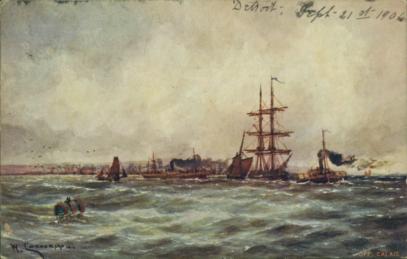 View of Calais waterfront with steamboats and sailing ships in the water. Barrel buoy in foreground. Printed on front: "W. Cannon, 1904. Off Calais" and Tuck logo. Handwritten on front: "Detroit, Sept. 21st, 1906." Printed on back: "Raphael Tuck & Sons 'Oilette'. 'Coasting Vessels'. Art publishers to their majesties the King & Queen. Printed in England. Tuck's post card." Handwritten on back: "Dear sister Lena: I received your letter and was very pleased. I suppose you didn't miss me very much, [?] you no doubt took my place O.K. Well, I will leave for home Saturday 5 p.m. on the dot. Come and visit Sunday night with Otto in Alpena and like the Holand [?] back 18 Rogers on Monday. Love to all from Ham [?] and myself. Ida." Card is postmarked September 26, 1906.