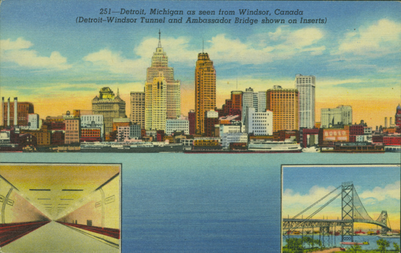 View of Detroit skyline with Detroit River in foreground. Inset views of Detroit-Windsor Tunnel and Ambassador Bridge. Printed on front: "Detroit, Michigan as seen from Windsor, Canada (Detroit-Windsor Tunnel and Ambassador Bridge shown on inserts." Printed on back: "Detroit's monuments in stone, spired, buttressed and often decorated with many colored materials form an imposing skyline with the Detroit River in the foreground. Detroit-Windsor Tunnel and Ambassador Bridge link Canada and the United States by a mere five minutes. United News Co., 24 West Jefferson Avenue, Detroit, Mich. Genuine Curteich-Chicago 'C.T. Art-Colortone' postcard (Reg. U.S. Pat. Off.)."
