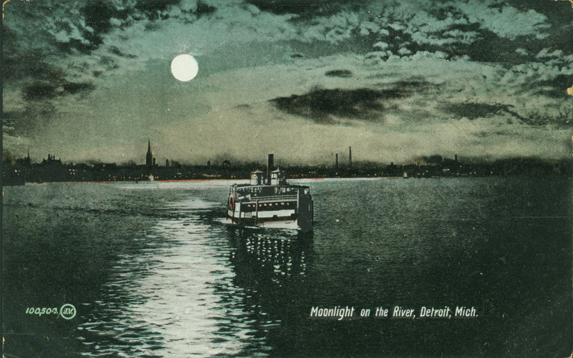 Boat sails across moonlight Detroit River; silhouettes of smokestacks and church spires. Printed on front: "Moonlight on the river, Detroit, Mich., 100303" with initials "J.V." in a circle. Printed on back: "The Valentine & Sons' Publishing Co., Ltd. Montreal and Toronto. Printed in Great Britain." Handwritten on back: "3/3/10."