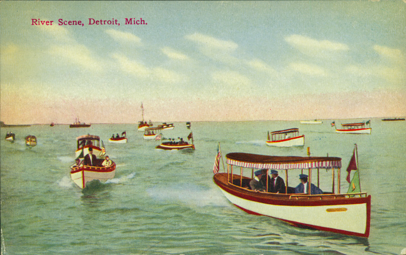 View of boaters on Detroit River. Printed on front: "River scene, Detroit, Mich." Printed on back: "The Detroit River has always been noted for the facilities afforded to all who are fond of aquatic sport. Gasoline launches and motor boats predominate, and almost any summer afternoon and evening the river will be found thickly covered with the small craft."