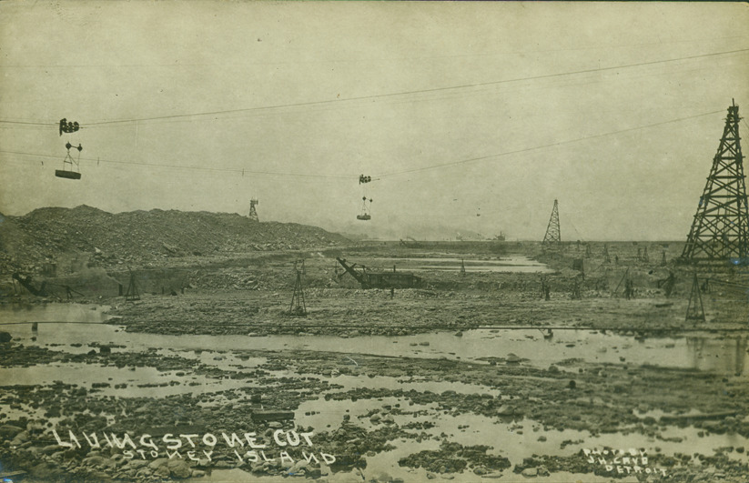 View along length of dry bed of the Livingstone Channel under construction. Towers on sides, with wires across the cut carrying loads. Steam shovel in middle distance. Printed on front: "Livingstone cut, Stoney [or Stony] Island, photo by J.H. Cave."