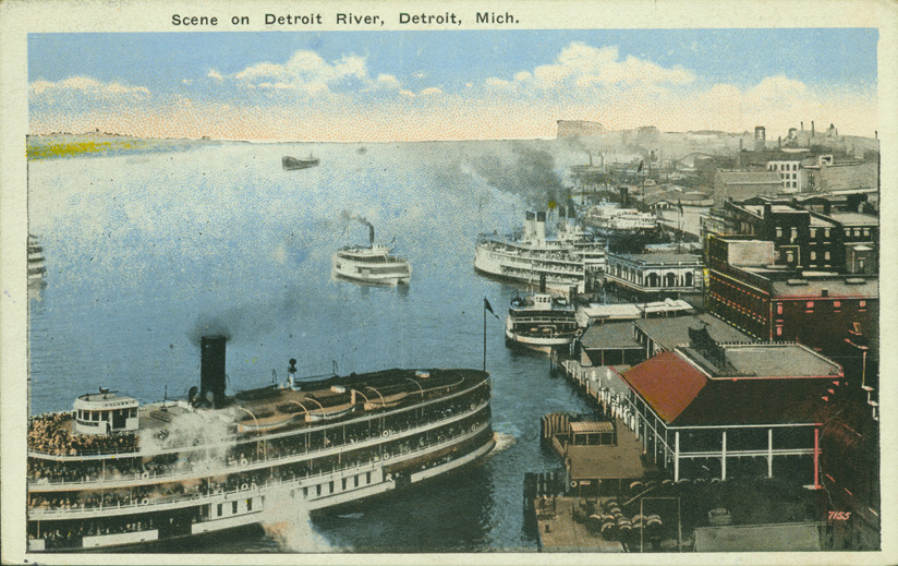 View from height along riverfront of steamers on Detroit River. Printed on front: "Scene on Detroit River, Detroit, Mich." Printed on back: "Excursion steamers, Detroit, Mich. Detroit is proud of its fleet of excursion steamers the finest in the world. More than eight million passengers arrive and depart from Detroit during the navigation season."