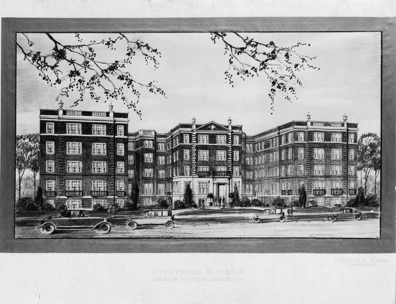 Architectural rendering of an apartment building. The image shows a large apartment building with several cars in the foreground. With printed caption: "Apartment building corner of Longfellow and Genesee. Charles N. Agree, architect." Stamped on the back: "Chas. N. Agree, architect. Received Feb. 1, 1928."