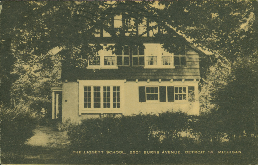 Stucco, shingle, and half-timbered building viewed through framing trees and bushes. Printed on front: "The Liggett school, 2501 Burns Avenue, Detroit 14, Michigan." Printed on back: "Artvue Post Card Co., 225 Fifth Ave., New York, N.Y." Handwritten on back: "Christmas greetings and all good wishes to you both go with this picture of our new home. We are enjoying being here for the holidays. Katharine Ogden." Card is postmarked December 22.