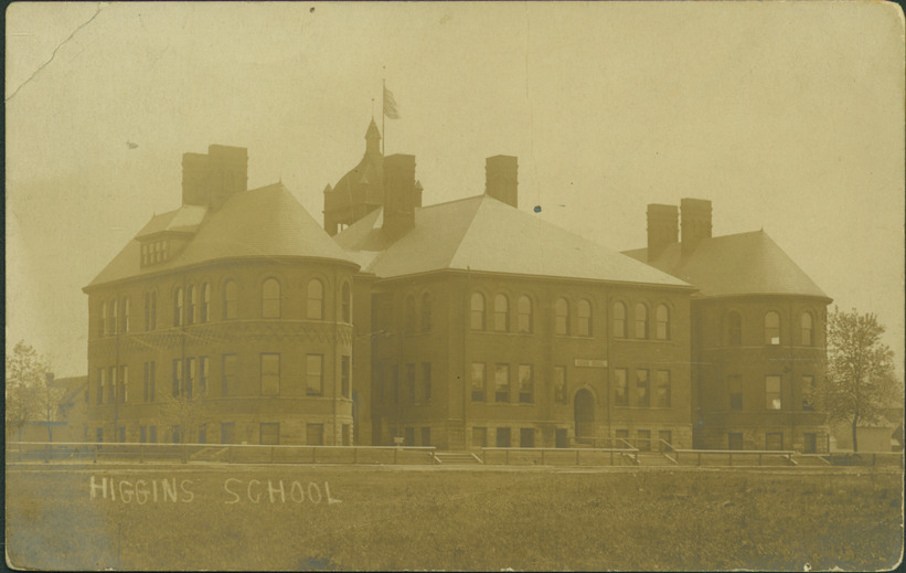 Favorite this☆ Higgins school Description: Two and a half-story brick school building, viewed at an angle across lawn. Tower behind central block; symmetrical wings on both sides of block, with rounded roofs and fronts. Written on front: "Higgins school." Details Resource ID: bh000190 Subject: School buildings--Michigan--Detroit Photographic prints Postcards Date Issued: Unknown year Format: 1 postcard ; 3.5 x 5.5 in. Member of: Burton Historical Collection Filing Location: D/Schools-Higgins Rights: Physical rights are retained by DPL. Copyright is retained in accordance with U.S. copyright laws.