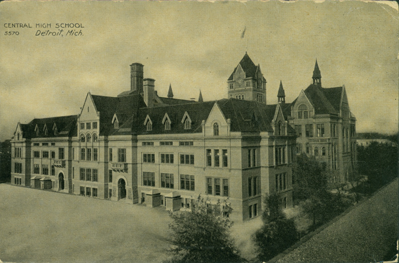Four and a half-story brick school, with central clock tower and symmetrical gabled wings on both sides. Viewed at an angle across intersection, past trees. U.S. flag flying from central clock tower. Printed on front: "Central High School, Detroit, Mich."