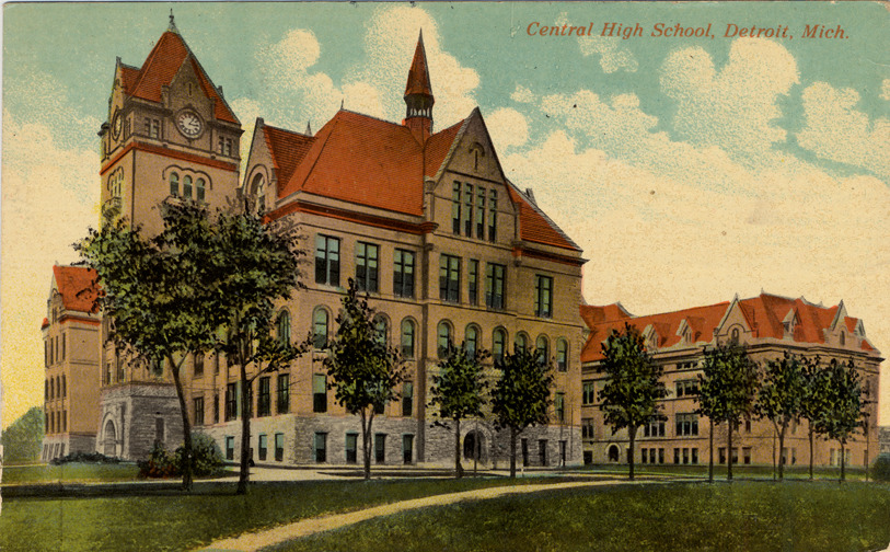 Side view of four and a half-story brick school, with central clock tower and symmetrical gabled wings on both sides. Viewed at an angle across lawn, past immature trees. Printed on front: "Central High School, Detroit, Mich." Printed on back: "The Central high school, situated on Cass Avenue is the leading public school of Detroit. The building and grounds occupy a complete block, and the site cost the Board of Education $130,350. The addition shown on the left was completed in 1908 at a cost of $250,000. The buildings represent an investment of three quarters of a million." Handwritten on back: "August 8, 1912. Seeing you sent me a picture of an Ann Arbor school building, I'll send a picture of our school building. I quit work today and am going away Saturday afternoon for 2 weeks vacation. I have decided to go up in Grand Lake near Alpena. Gray." Card is postmarked August 9, 1912.