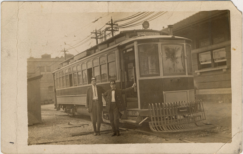 Two railroad workers posed next to street-car. 'Woodward' sign is seen on top and side of car. The word 'out' is written on the front of the steps leading into the car. Handwritten on back: "Friend Bolivar - Now [sic] doubt you will be surprised to here [sic] from and see your old Red."