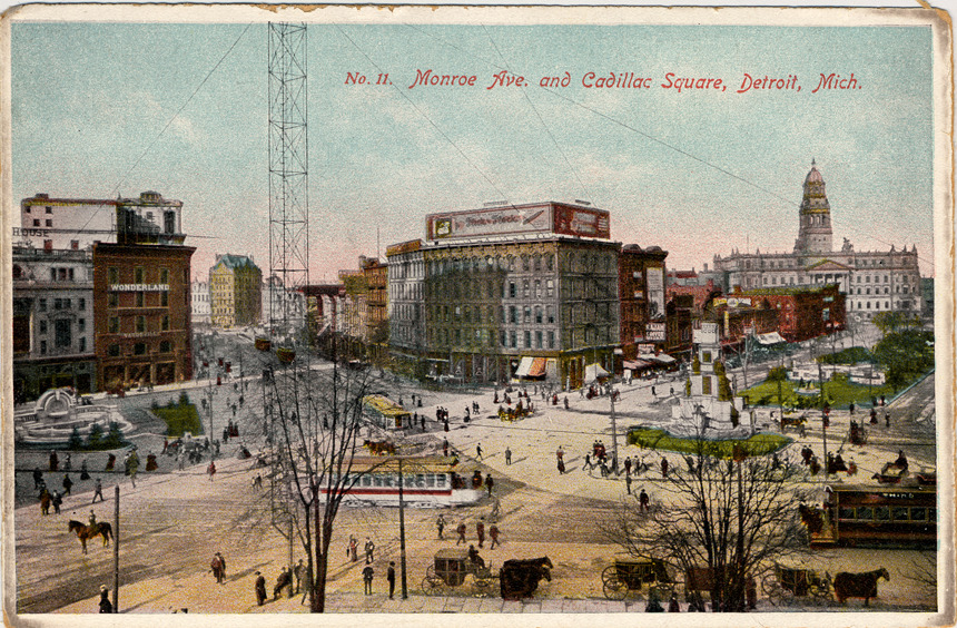 View across Cadillac Square and up Monroe Avenue. City hall in distance; Soldiers' and Sailors' Monument and fountain in square. Streetcars and horse-drawn vehicles. Printed on front: "Monroe Ave. and Cadillac Square, Detroit, Mich." Printed on back: "Published by Wolverine News Co., Detroit, Mich. and Leipzig. Made in Germany."