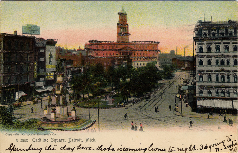 Cadillac Square, looking past Soldiers' and Sailors' Monument to the county building. Printed on front: "Cadillac Square, Detroit, Mich. Copyright 1904 by the Rotograph Co." Handwritten on front: "Spending the day here - Leola is coming home tonight. I'm going to N. Scotia. [?]" Printed on back: "The Rotograph Co., N.Y., City. (Germany)." Card is postmarked June 12, 1906.
