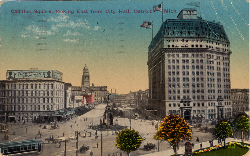 Cadillac Square past Soldiers' and Sailors' Monument and Ponchartrain Hotel to county building. Cars, street-cars, horse-drawn vehicles, and pedestrians. Billboard advertises "Turkish trophies." Printed on front: "Cadillac Square, looking east from City Hall, Detroit, Mich." Printed on back: "Cadillac Square, Detroit, Mich. Cadillac Square runs east from Campus Martius to county building and was named after the founder of Detroit, Antoine Laumet De La Mothe Cadillac. Cadillac Chair is located on the west, which was formerly the site of the Old City Hall built in 1836 and occupied until 1871 as the seat of civic authority. Cadillac arrived in Detroit July 24, 1701. On that day, under the patronage of Louis XIV, the city of Detroit, then called Fort Pontchartrain, was founded. Published by United News Co., Detroit, Mich." Handwritten on back: "4-3-15. Vernon I hit this spot yesterday when I was alone. Nina and I have just come back from the city, but am going [to] town this afternoon, after lunch, and going to take supper downtown and then go to a show. Marie." Card is postmarked April 8, 1915.