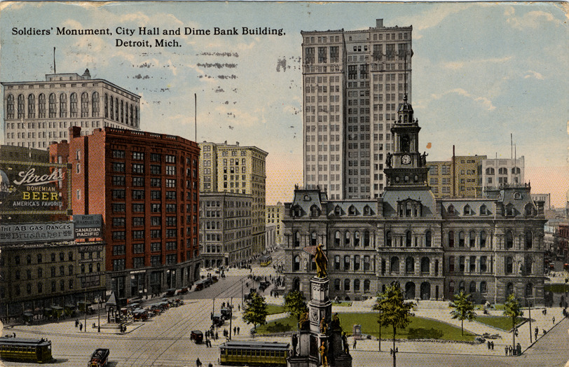 View of the Soldiers' and Sailors' Monument, City Hall (to the right) and the 23-story Dime Bank building (behind City Hall). The Ford building is also visible along with the Hammond and Penobscot buildings. Printed on front: "Soldiers' monument, city hall and Dime Bank building, Detroit, Mich." Printed on back: "The view shows the highest and largest office building in Michigan. The Dime Bank in rear of City Hall is 23 stories high and contains 1000 offices. The other white building is the Ford and contains 559 offices and is 10 stories high. The Hammond and Penobscot buildings are at the left of City Hall." Handwritten on back: "8/13/14. Hello Nina: How is everyone out there? I am fine and having a great time. This sure is some city. Tell everyone hello for me. With love in a heap for you I remain as Katharine D." Card is postmarked August 13, 1914.