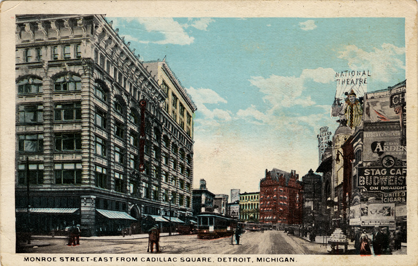 Monroe Avenue looking east from Cadillac Square. Buildings, street-cars and pedestrians shown. Printed on front: "Monroe Street - east from Cadillac Square, Detroit, Mich."