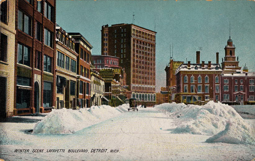 Scene of Lafayette Boulevard during winter. Buildings are in view; snow covers sidewalk and street. Horse-drawn vehicle travelling down road. Signs for Gayety and Lafayette theatres. Printed on front: "Winter scene, Lafayette Boulevard, Detroit, Mich." Printed on back: "A winter scene on Lafayette Boulevard. The scene pictured here is typical of a heavy fall of snow in Detroit, and shows one of the many streets to be found in this picturesque condition just as the street cleaning department had succeeded in making traffic possible. It costs the city thousands of dollars and requires the labor of hundreds of men to clean off the snow after a heavy storm. Published by A.C. Dietsche, Detroit, Mich., and Frankfurt, Germany. Made in Germany.