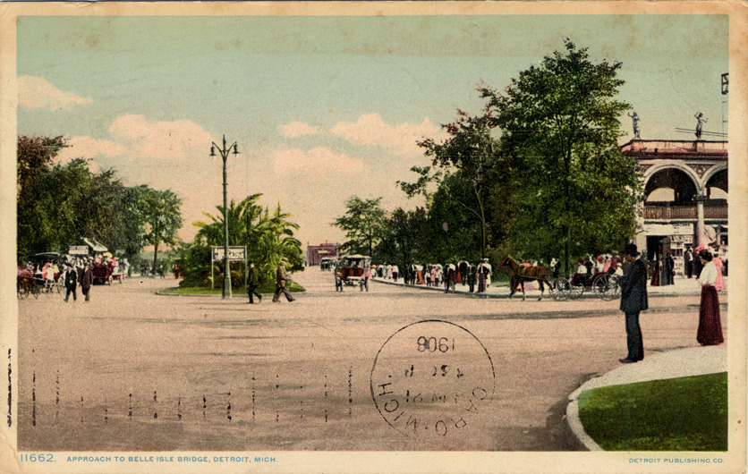 Scene of horse-drawn vehicles and pedestrians making their way towards the Belle Isle bridge from Jefferson Avenue. Postmark on front reads: "Caro, Mich. 1908." Printed on front: "11662. Approach to Belle Isle bridge, Detroit, Mich." Printed on back: "'Photostint Card'. Made only by The Detroit Pubishing Co." Handwritten on back: "6/21/08. 11p.m. Arrived at 10:20 and at work again. (Illegible) very warm here now. Geo." Card is postmarked June 22, 1908.