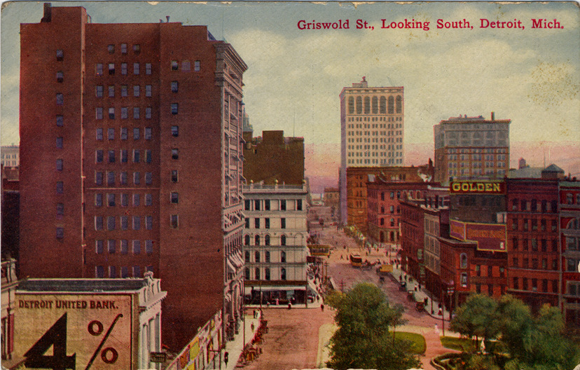 Griswold Street viewed from a height. Capitol Square Park seen in foreground; Chamber of Commerce on the left and Penobscot and Ford buildings seen in the distance to the right. Printed on front: "Griswold St., looking south, Detroit, Mich." Printed on back: "Griswold Street is named after one of Detroit's prominent pioneers, and has often been termed the city's Wall Street. A large number of Detroit's banks, as well as other financial interests are centered here. It is the financial heart of the city. Griswold Street runs approximately north and south, and is the first street west of Woodward Avenue. The scene here shows Capitol Square Park in the foreground with the Chamber of Commerce on the left and the Penobscot and Ford buildings in the distance on the right."