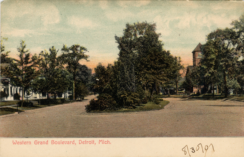 Wide unpaved residential road with large houses and central island. Trees on island and along road, partially obscuring houses. Printed on front: "Western Grand Boulevard, Detroit, Mich." Handwritten on front: "8/30/07." Printed on back: "Wolverine News Co., Detroit, Mich. (Printed in Germany)."