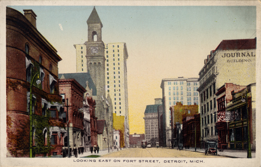 View along Fort Street. Automobiles parked on street, pedestrians on sidewalk and a street-car travels down the road. Signs include "Journal building" and "Detroit Saturday night." Printed on front: "Looking east on Fort Street, Detroit, Mich." Printed on back: "Looking east on Fort Street from Detroit Club with the Post Office Tower and new Dime Savings Bank building and Pontchartrain in the distance. Pub. by The Detroit News Company, Detroit, Mich." American News Co. publisher trademark printed on back.