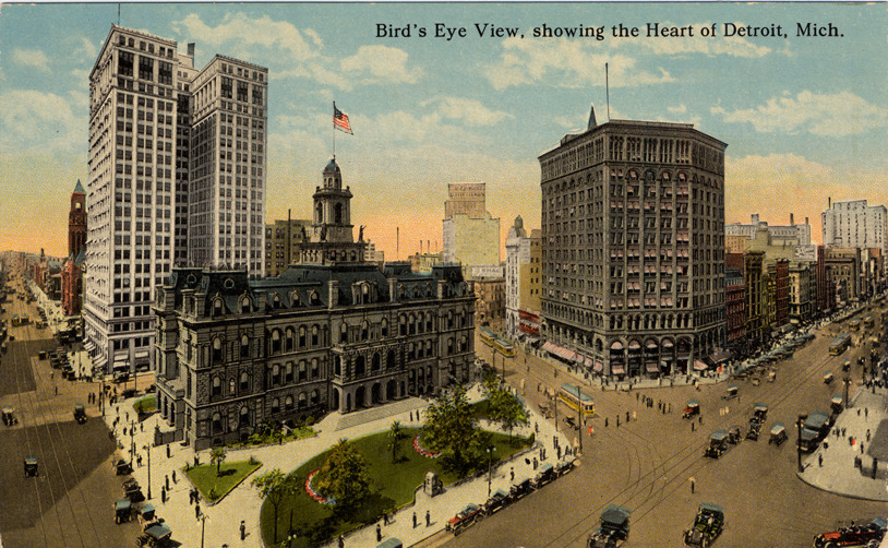 View across Campus Martius from a height. City hall to left with Dime Bank building behind it. Majestic building to right. Automobiles, street-cars, and pedestrians are visible. Printed on front: "Bird's eye view, showing the heart of Detroit, Mich." Printed on back: "Bird's eye view, showing the heart of Detroit, Mich. The Majestic building at the right is one of Detroit's first skyscrapers. The high building in rear of City Hall is the Dime Bank building recently built. C.T. Co., Chicago, R-71177."