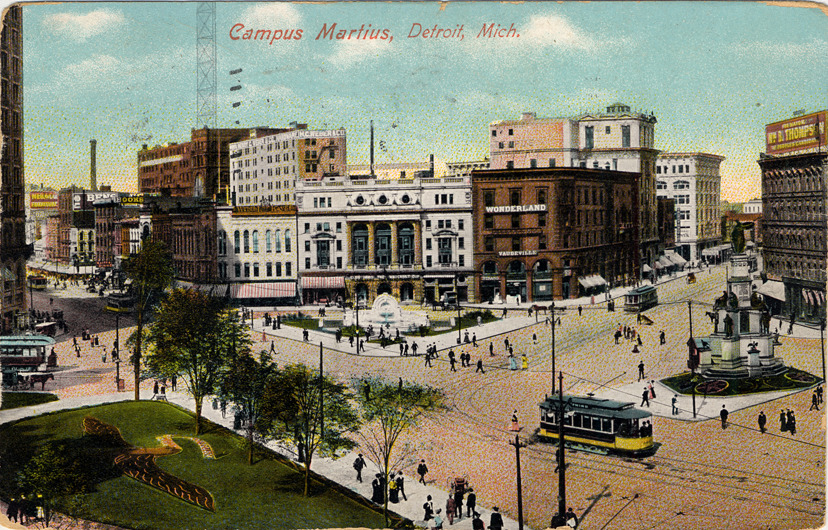 View across Campus Martius from a height. Detroit Opera House and Temple Theatre across plaza, with Palmer fountain in front of the buildings. Soldiers' and Sailors' Monument to right. Street-cars and pedestrians visible. Printed on front: "Campus Martius, Detroit, Mich." Printed on back: "Campus Martius. The business center of Detroit is the Campus Martius situated at the converging of Lafayette, Monroe, Michigan and Woodward Avenues. It was reserved as a breathing spot in the 'Governor and Judges' plan, adopted for the city in its early history and has been beautified by a fountain donated by Mr. Thomas W. Palmer. On its front [it fronts?] the City Hall, Majestic building, Detroit and Temple Theaters and other prominent factors in the city life. Published by A.C. Dietsche, Detroit, Mich. and Frankfort, Germany. Made in Germany." Handwritten on back: "Detroit, Aug. 11 - 09. Hello Bea: - how's the weather and little Dorothy? Now tell me did you name her that for my sake? The same as Lottie did? Drop me a card sometime. Hoping all are well. With love, Yours, Dorothy Feltz(?)." Card is postmarked August 12, 1909.