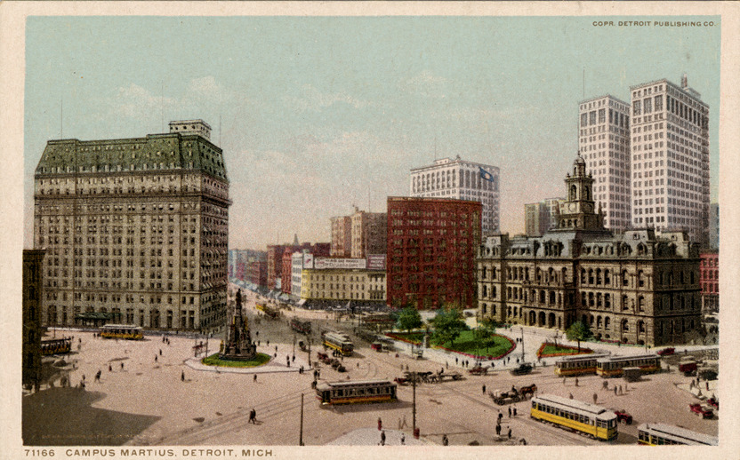 View across Campus Martius from a height. City hall to right with Dime Bank building behind it. Soldiers' and Sailors' Monument to left. Street-cars, horse-drawn vehicles and pedestrians visible. Printed on front: "Campus Martius, Detroit, Mich. Copr. Detroit Publishing Co." Printed on back: "Phostint. Trade mark, reg. U.S. Pat. Off. Made only by Detroit Publishing Co."
