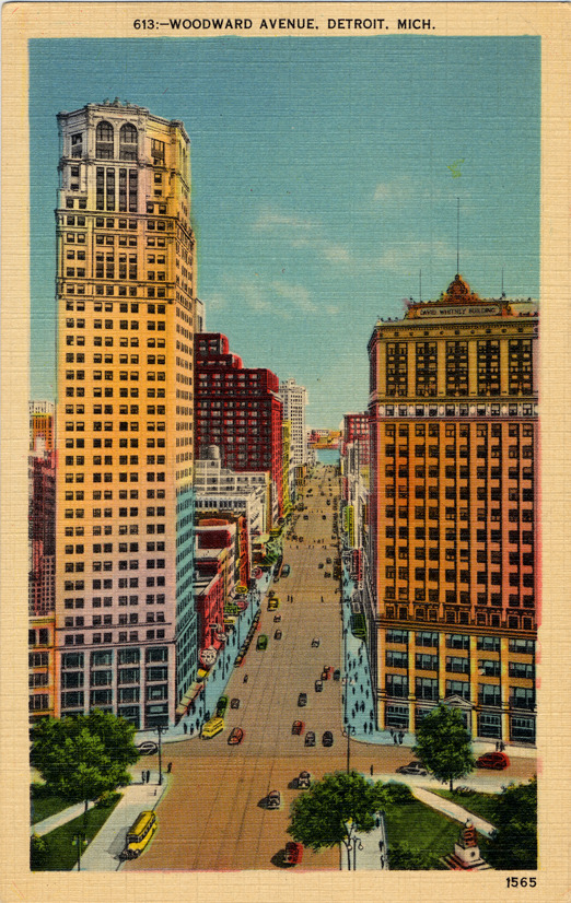 View of Eaton tower and David Whitney building at Woodward near Grand Circus Park. Detroit River is seen in the distance at the end of the road. Street-cars, buses, automobiles and pedestrians visible. Printed on front: "613, Woodward Avenue. Detroit, Mich., 1565." Printed on back: "Metrocraft, Everett, Mass. Made by Metropolitan, Everett, Mass."