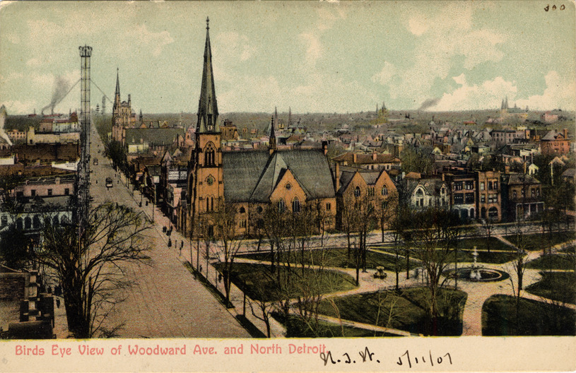 View along Woodward Avenue from a height. Church with steeple shown beyond Grand Circus Park across street; another church in distance. Leafless trees in park; fountain in center of radiating sidewalks. Street cars and pedestrians visible. Printed on front: "Bird's eye view of Woodward Ave. and north Detroit." Handwritten on front: "5/11/07." Printed on back: "Wolverine News Co., Detroit, Mich. (Printed in Germany)."