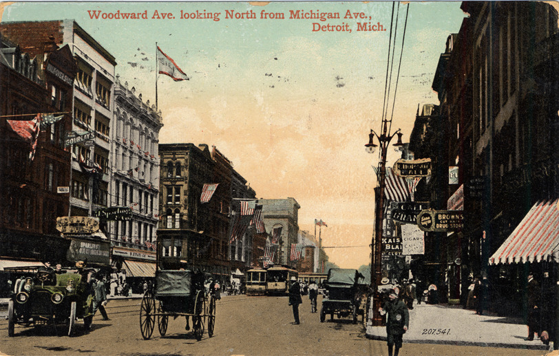View along commercial district of Woodward Avenue. Street-cars, automobiles, horse-drawn vehicles and pedestrians visible. Signs include "Walkover shoe," "Gourlay's," "B. Siegel Co.," and "Brown's Cut-Rate Drug Store." Printed on front: "Woodward Ave. looking north from Michigan Ave., Detroit, Mich. 207541." Handwritten on back: "2/23/09. Well, I suppose you had a fine time in Escanaba. Wrote mother a letter today. It has been dark and gloomy all day, and it rained quite hard this morning. Funny weather. Have not been feeling very well today. Awfully warm. E.A.S." Card is postmarked February 23, 1909.