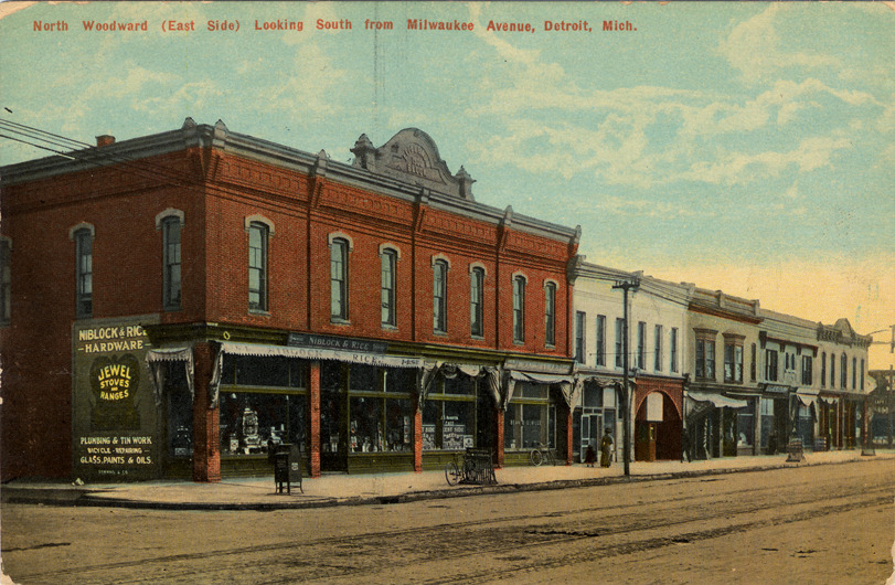 Commercial buildings viewed at an angle across Woodward Avenue. Mailbox on corner; bicycle racks by curb. Street-railroad tracks on unpaved road. Sign reads "Niblock and Rice hardware store, jewel stoves and ranges, plumbing and tinwork, bicycle repairing, glass, paints and oils." Printed on front: "North Woodward (east side) looking south from Milwaukee Avenue, Detroit, Mich." Printed on back: "Pub. by The Detroit News Company, Detroit, Mich." American News Co. publisher trademark printed on back. Handwritten on back: "10/15/10."