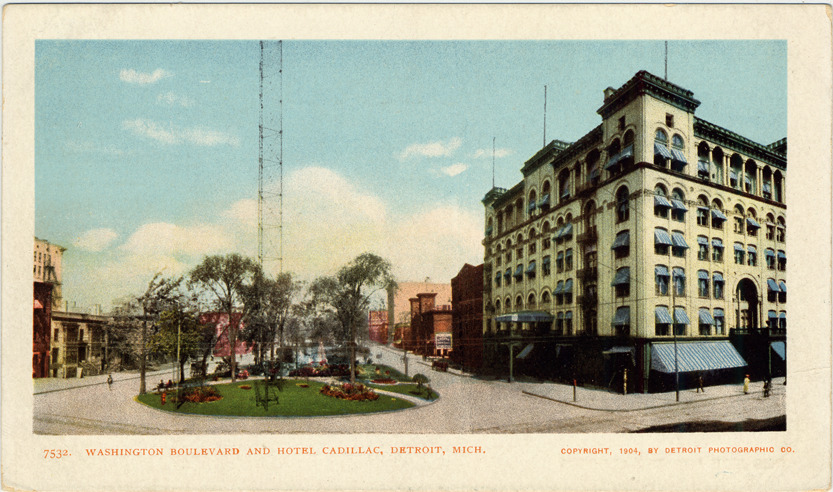 View along Washington Boulevard with planted median in center and Hotel Cadillac to right. Other buildings visible in distance. Printed on front: "7532. Washington Boulevard and Hotel Cadillac, Detroit, Mich. Copyright, 1904, by Detroit Photographic Co."