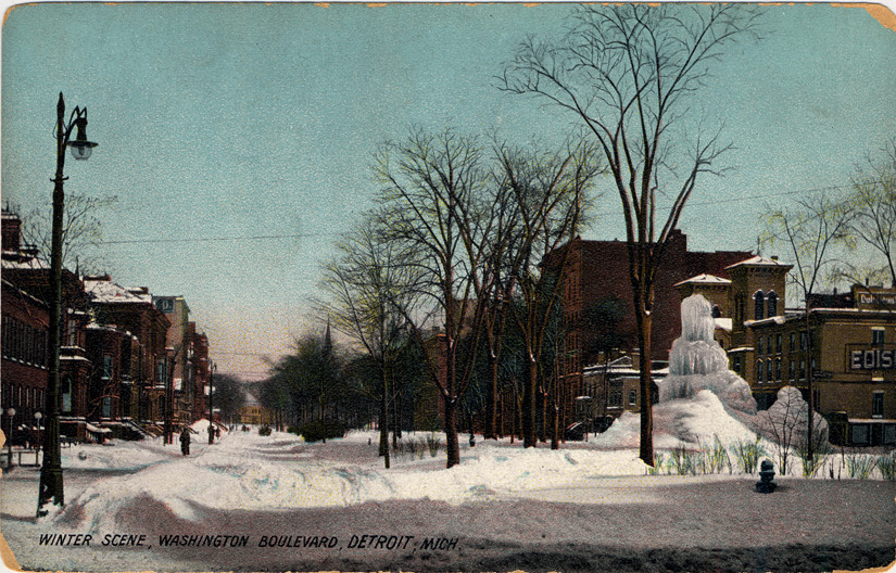 View of park in Washington Boulevard; ice fountain on the right. Printed on front: "Winter scene, Washington Boulevard, Detroit, Mich." Printed on back: "Winter scene on Washington Boulevard. One of the unique features of Detroit in winter is the famous ice fountain on Washington Boulevard. Several jets of water are allowed to play all winter, and the result is a massive berg of ice which sometimes reaches a height of nearly thirty feet, and contains many tons of the crystal. The scene pictured shows the Boulevard on a snowy morning. 175. Published by A.C. Dietsche, Detroit, Mich., and Frankfort, Germany. Made in Germany." Handwritten on back: "Yr 1909."