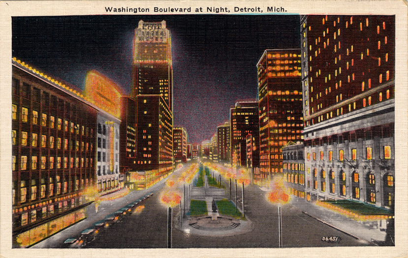 Scene of Washington Boulevard at night. Street lights and buildings lit. Automobiles travel with headlights shining. Statue of Macomb seen in the distance. Printed on front: "Washington Boulevard at night, Detroit, Mich. 36451." Printed on back: "Published by United News Co., Detroit, Mich. Made in U.S.A."