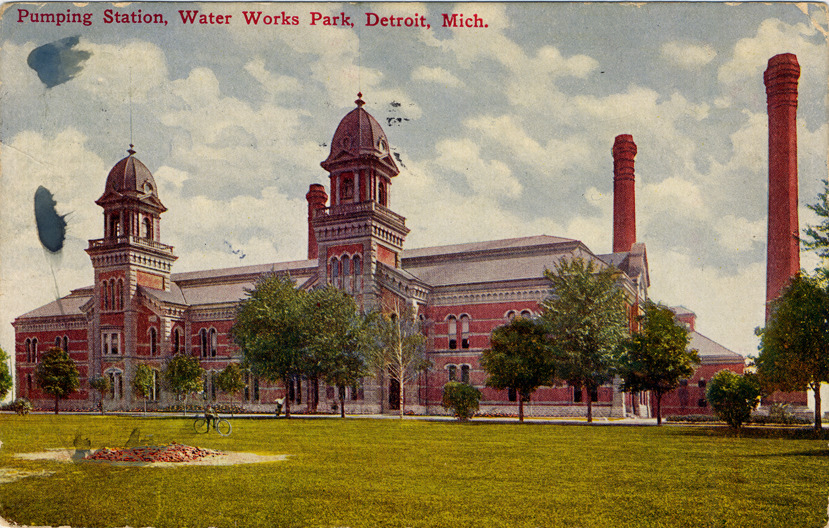 View of the pumping station at Waterworks Park. Brick building has twin towers with cupolas; smokestacks in background. Printed on front: "Pumping station, Water Works Park, Detroit, Mich." Handwritten on back: "Dear Mrs. W. Your card received yesterday and Mr. W. called last evening and read your letter to me. I think that ... will do you [?] Hope you will stay a long time, but I miss you very much. (rest is illegible)." Card is postmarked February 10, 1910.