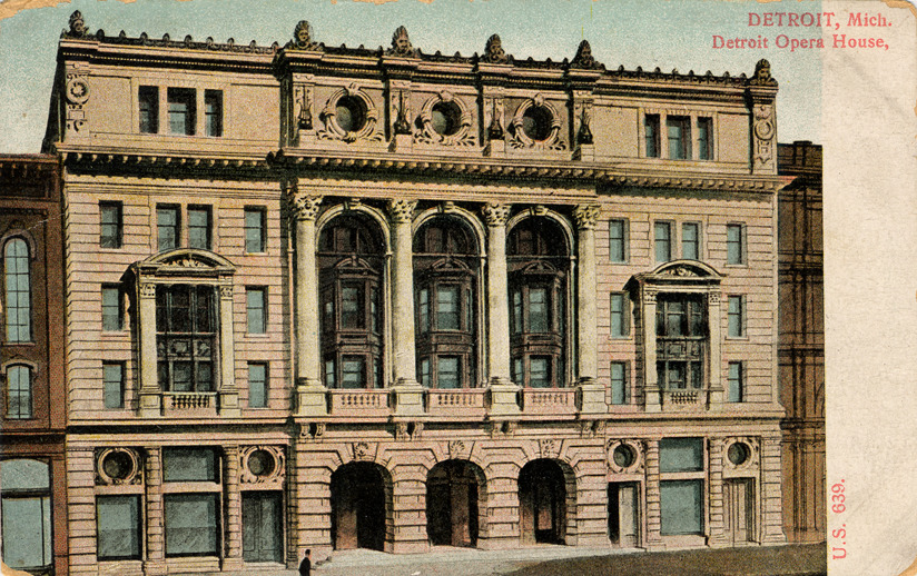 The Detroit Opera House viewed at an angle. Printed on front: "Detroit, Mich. Detroit Opera House. U.S. 639." Printed on back: "Printed in Germany. F. von Bardeleben, New York & Germany." Handwritten on back: "Tell everybody hello. Am having fine time. Knott."