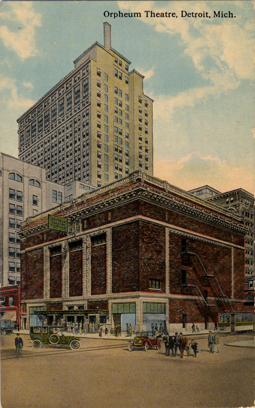 Orpheum Theatre, viewed at an angle across intersection. Metal exit stairs down side of building. Sign reads "Orpheum Theatre, vaudeville." Printed on front: "Orpheum Theatre, Detroit, Mich." Printed on back: "Orpheum Theatre, Detroit, Mich. Orpheum Theatre, corner Lafayette and Shelby Streets. Largest and most beautiful playhouse in Michigan, presenting high class vaudeville. Seating capacity 2130. Washed air ventilation, absolutely fire-proof. C.T. Co., Chicago, R-38534."