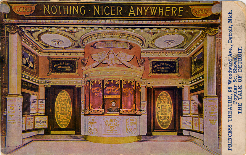 Theatre ticket booth and covered entryway with two doors, advertising 5 cent shows. A sign above the theater reads "Nothing nicer anywhere." Printed on front: "Princess Theatre, 98 Woodward Ave., Detroit, Mich. Popular 5c. shows. The talk of Detroit." Printed on back: "H.M. Taylor, art publisher, Detroit, Mich." Handwritten on back: "9/30/08."