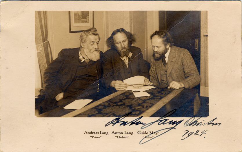 Andreas Lang, Anton Lang, and Guido Mayr, all performers in the Oberammergau passion play, are seated at table looking at folded papers. Printed on front: "Andreas Lang 'Petrus', Anton Lang 'Christus', Guido Mayr 'Judas.'" Handwritten on front (signature): "Anton Lang, Christus, 1924."