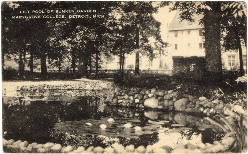 View of lily pond at Marygrove College. Banks of pond are lined with stones; trees and college building in background. Printed on front: "Lily pool of sunken garden, Marygrove College, Detroit, Mich." Printed on back: "Artvue Post Card Co., 225 Fifth Ave., New York, N.Y."